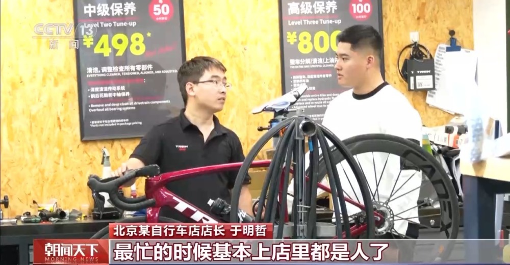 北京某自行车店店长 于明哲: 北京到了适合骑行的季节了,所以我们这边维修的活,包括售后有增长,最忙的时候基本上店里都是人了。
